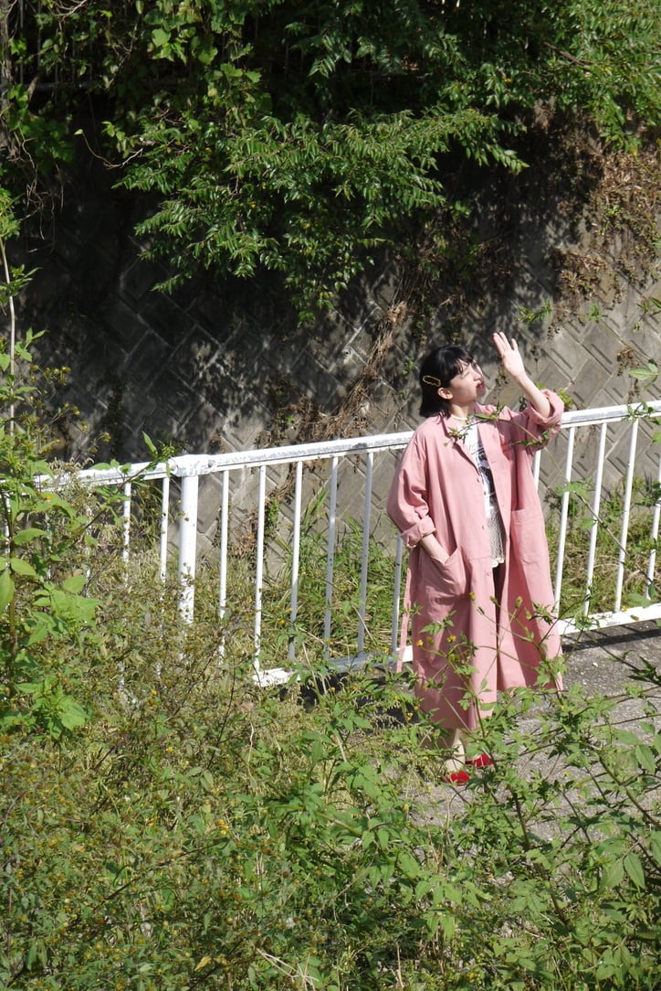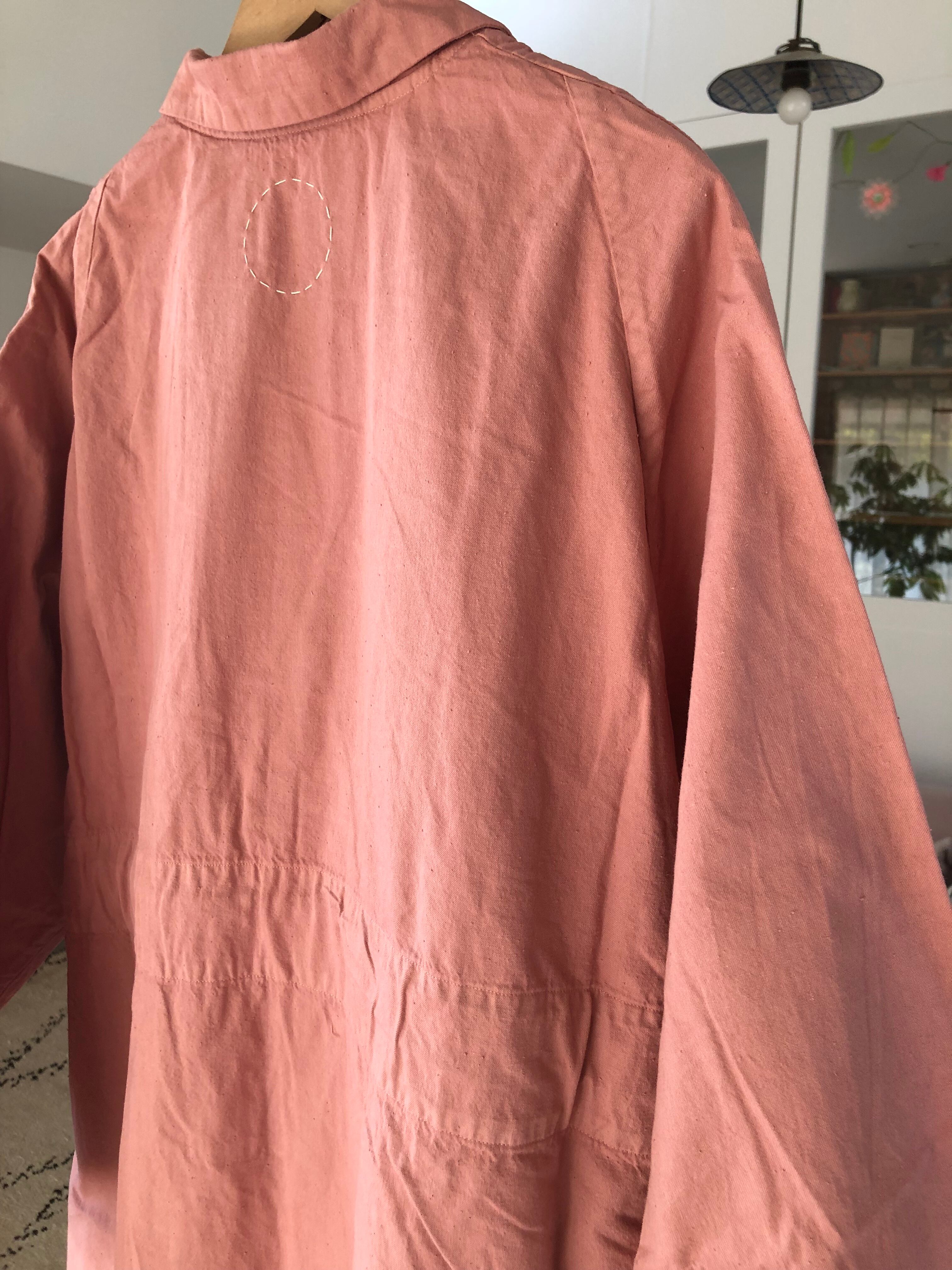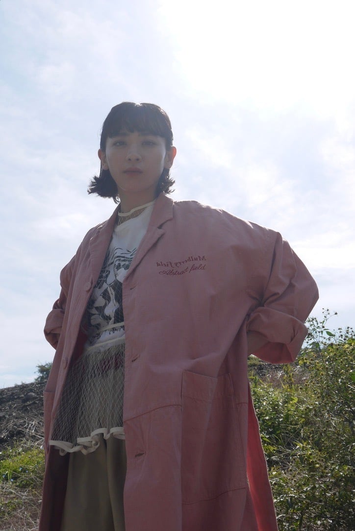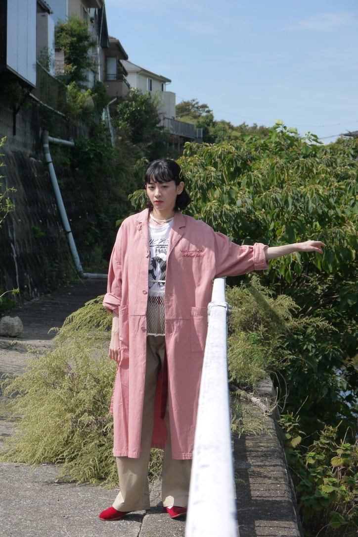 長い着丈と開襟、大きなパッチポケットが研究員の制服のよう。