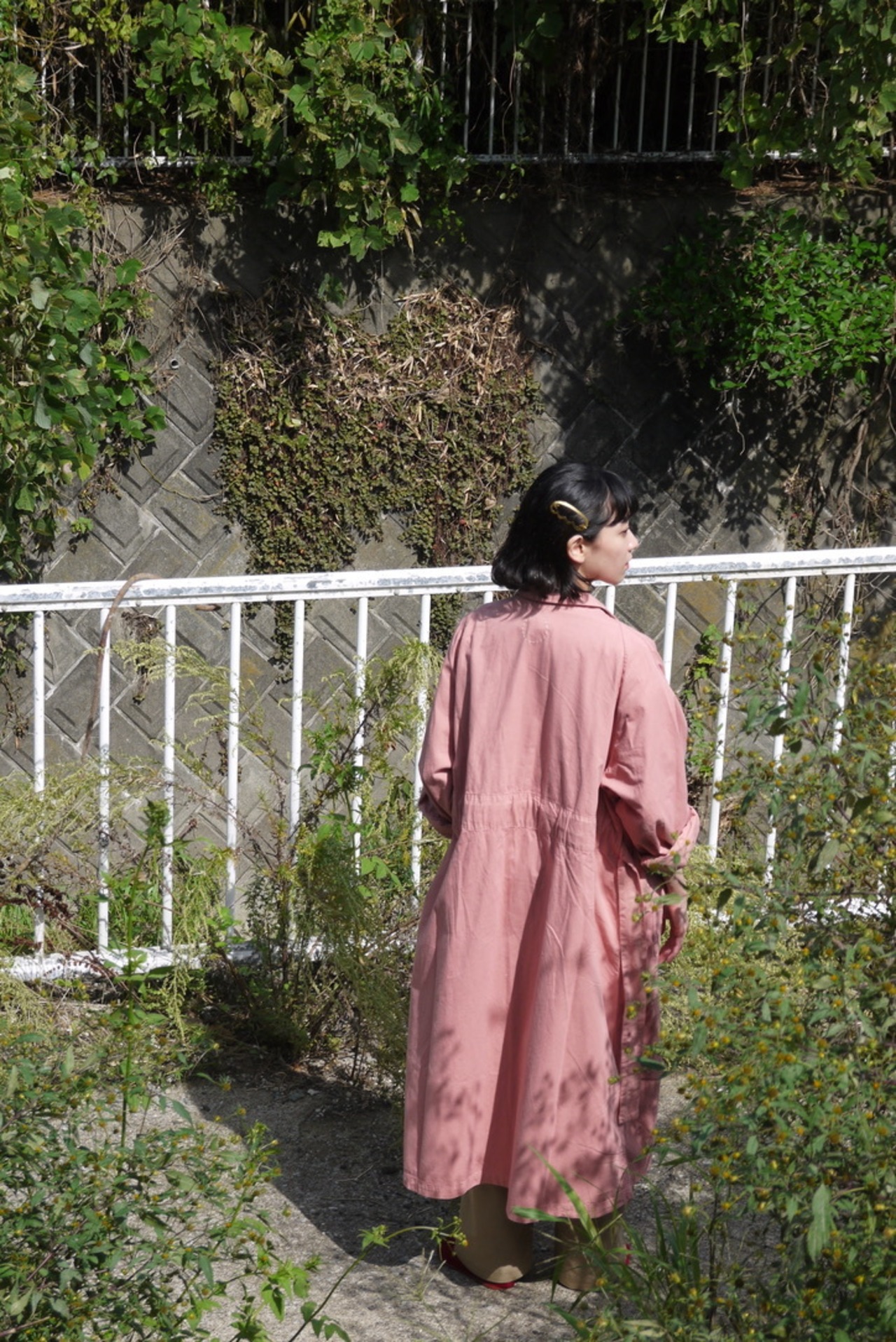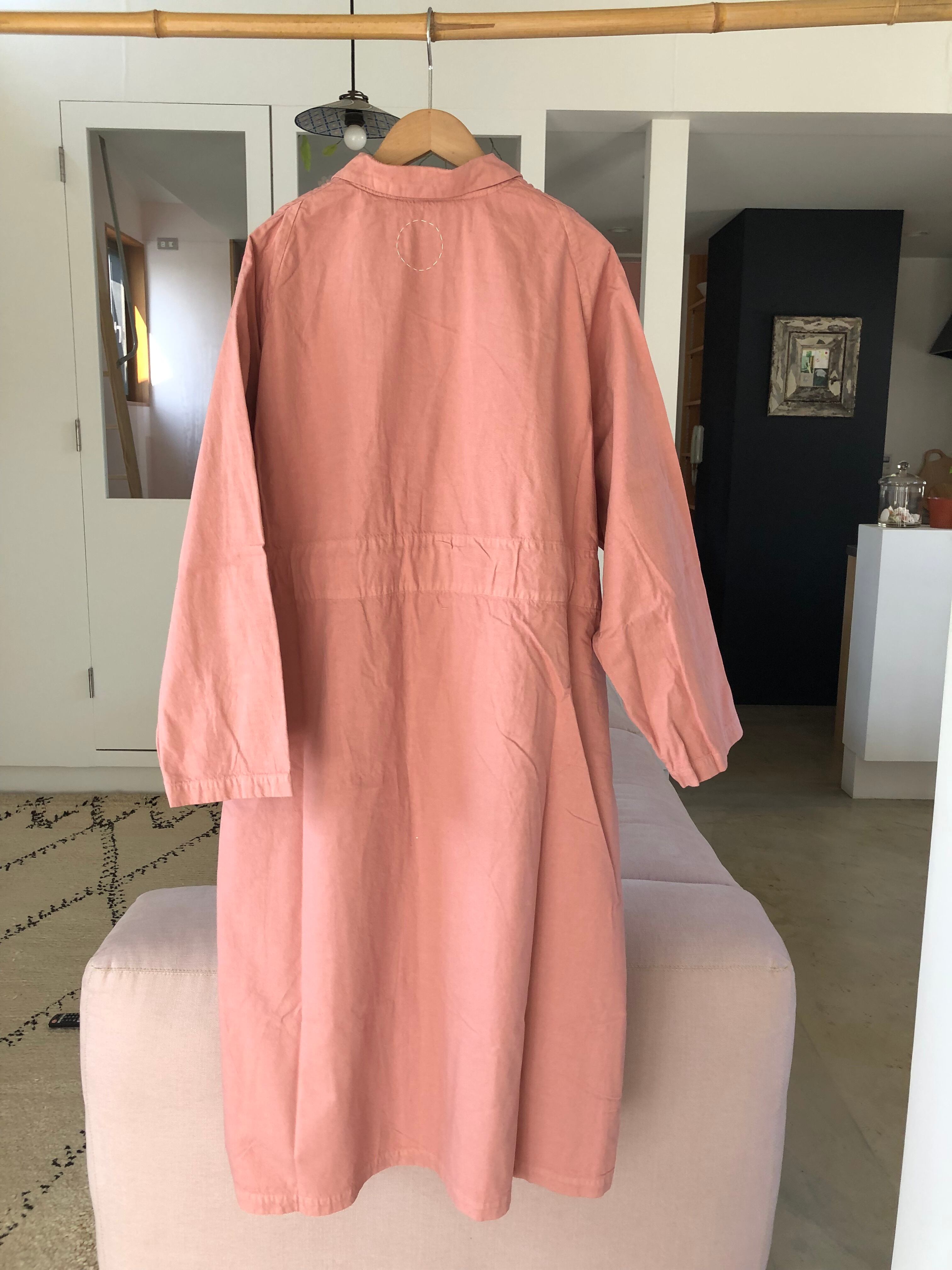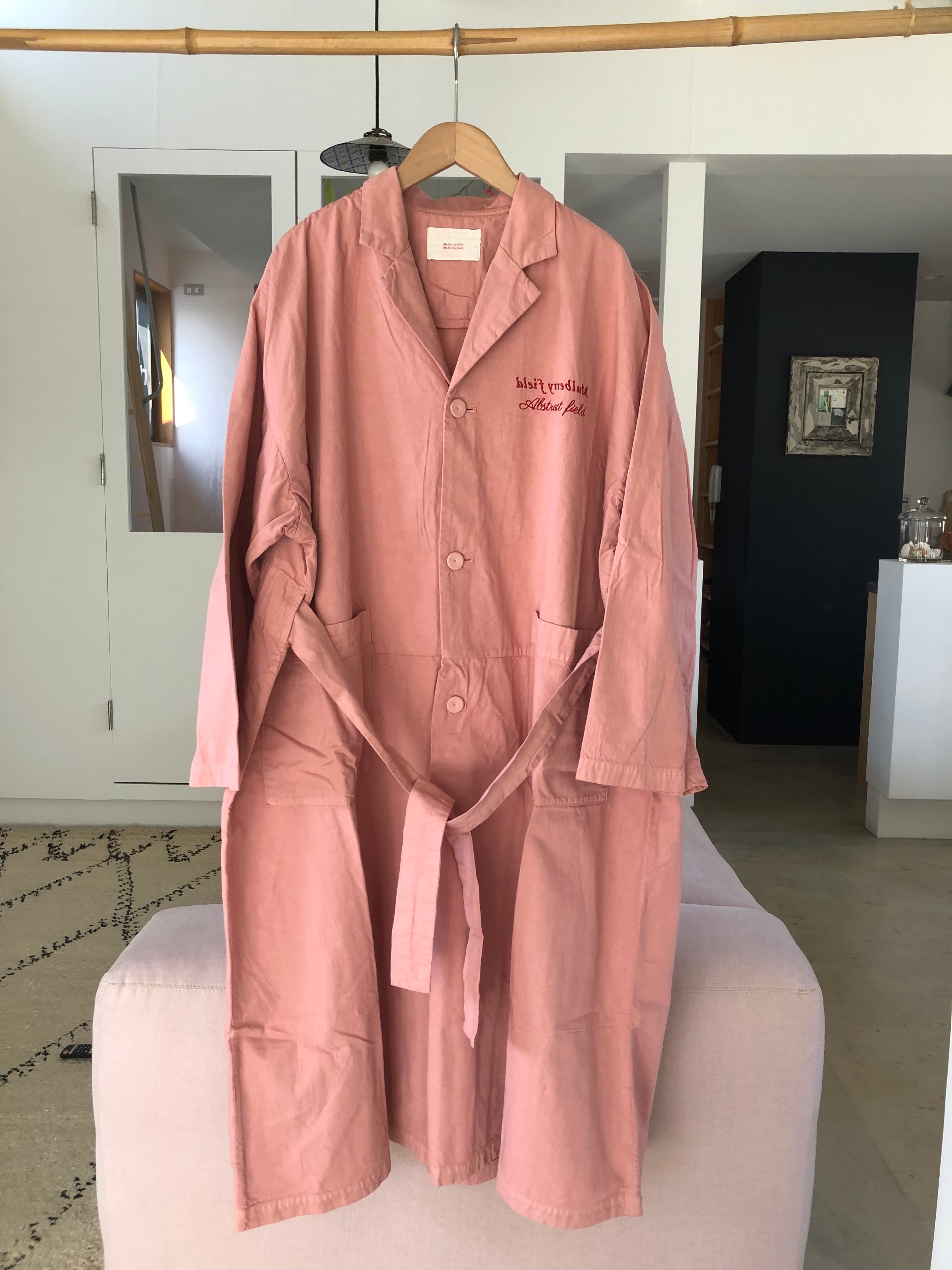 長い着丈と開襟、大きなパッチポケットが研究員の制服のよう。