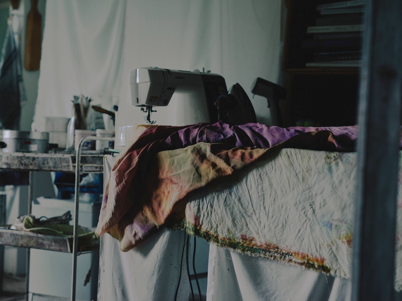 臈纈染め・抜染・顔料によるシルクスクリーンなど、多様な技法を組み合わせ、布の上に多層的で自由な表現を探求、再現性のない独自の美を目指す。